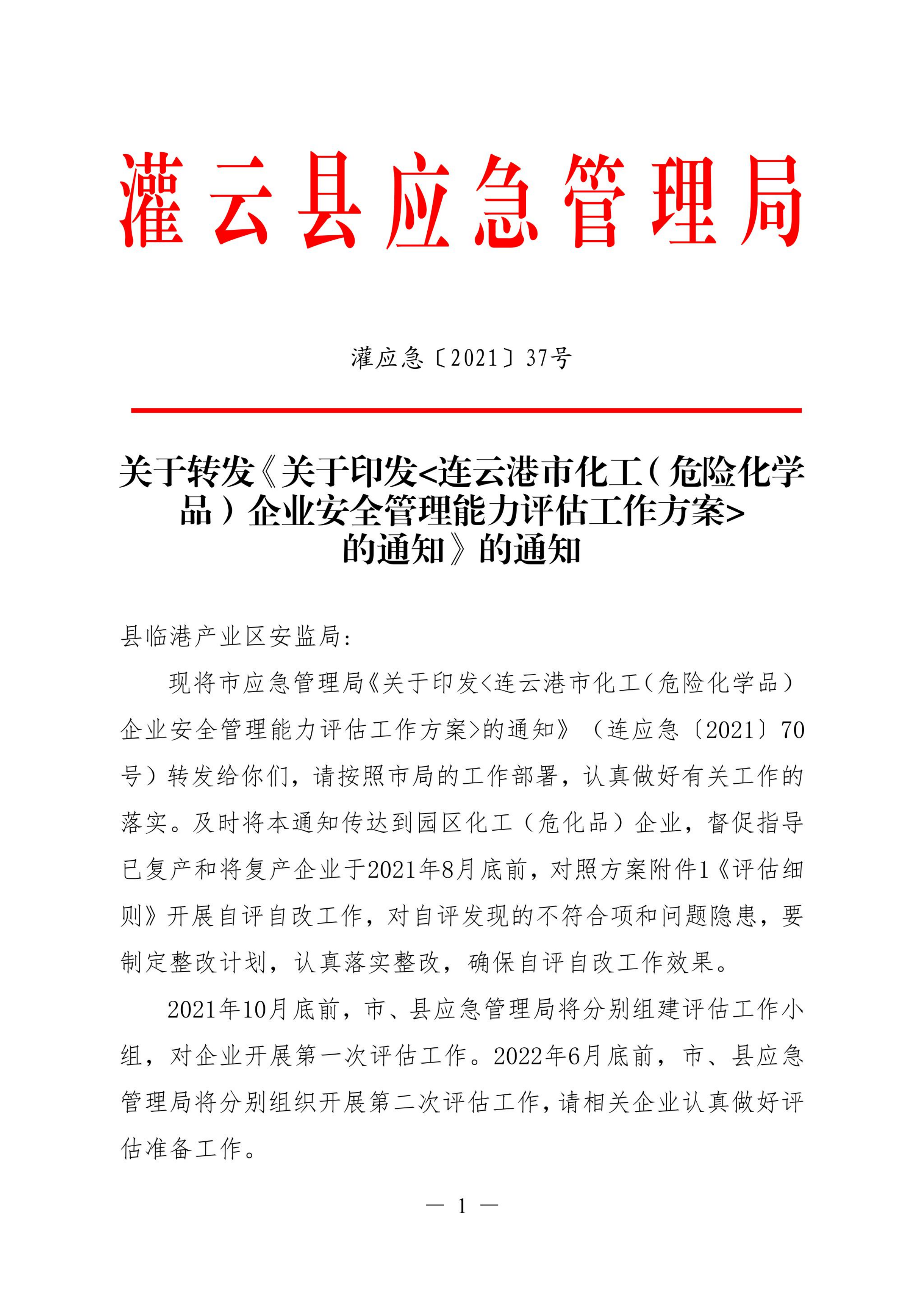 关于转发《关于印发〈连云港市化工(危险化学品)企业安全管理能力评估工作方案的通知》的通知
