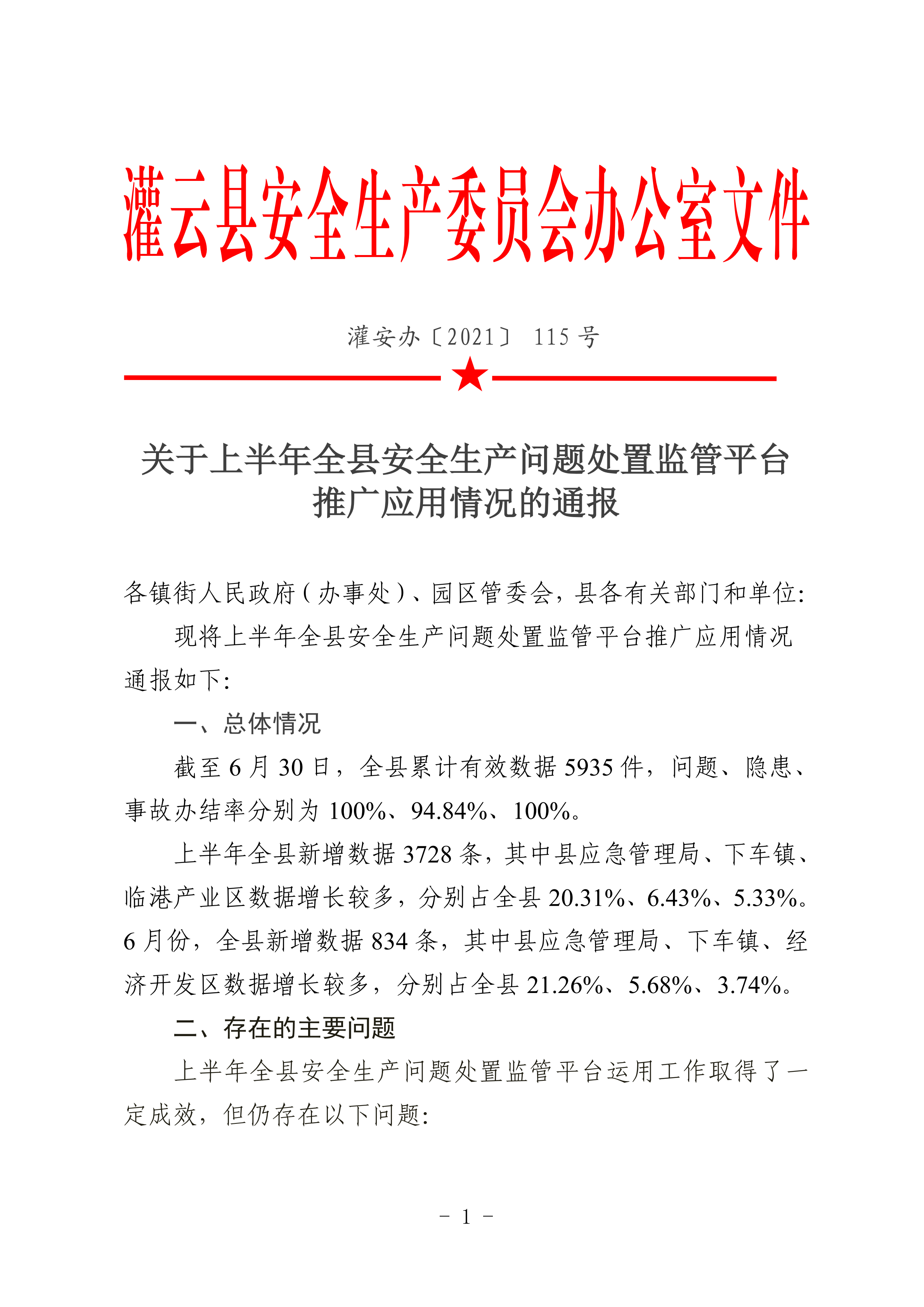 关于上半年全县安全生产问题处置监管平台推广应用情况的通报